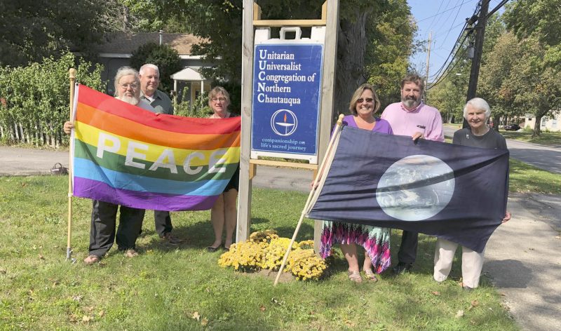 Leaders of the Unitarian Universalist Congregation of Northern Chautauqua (UUCNC) prepared to hang new flags at their new meetinghouse, following recent vandalism of rainbow peace flags at a number of locations in Fredonia. The flags represent several principles affirmed by Unitarian ...