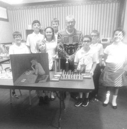 Pictured is Walt Sedlmayer with some of the students in the chess club at Northern Chautauqua Catholic School. Tuesday was the final chess session for the school year.