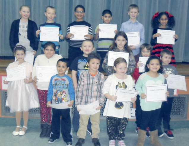 School 7 Elementary Principal Michele Heenan awarded Student of the Month certificates to the following students who were chosen by their teachers. Front row from left: Kenderson Costa, Liam McMurray, Jamiee Kelsey and Cianni Rosas. Middle row: Gracey Kozlowski, Amilia Ruiz, Devon Centner, Samantha Wielgasz, Alexander Madurski and Ayden Centner. Back row: Anna Delcamp, Thomas Shaffer, Jayden Kenner, Luis Pagan, Zachary Zentz and Amilcar Centeno. Samantha Wielgasz represented School 7 at the January Board of Education meeting.