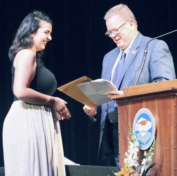 Submitted Photo Anna Gullo is presented the Fredonia-Pomfret Democratic Association ‘s annual $500 John F. Kennedy Scholarship by Michael Ferguson, Democratic candidate for Chautauqua County executive.