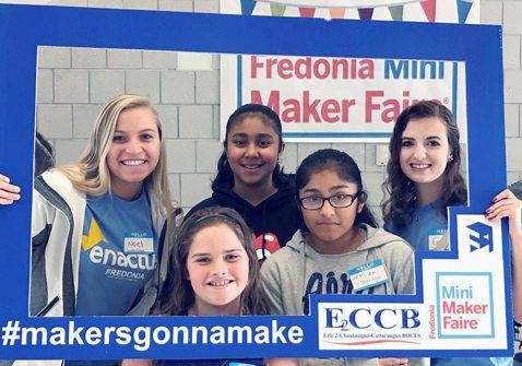 FutureHER has upheld its partnership with Chautauqua Striders by actively participating in the “Strides 4 S.T.E.A.M.” program. Enactus members work with middle school girls in order to motivate them in strengthening their science, technology, engineering, art, and mathematics (S.T.E.A.M) education. They also develop their public speaking skills, confidence in professionalism and learn about entrepreneurship. The schools involved include Fredonia, Dunkirk, Brocton, Westfield, Silver Creek and Forestville. The program was kicked off with the FutureHER members and the middle school girls attending the Mini Maker Faire at SUNY Fredonia in October. The project is supported by grant funding from The Northern Chautauqua Community Foundation, The Education Coalition, and The Community Foundation for Greater Buffalo, along with the leadership of Michele Starwalt, North Director for Striders.