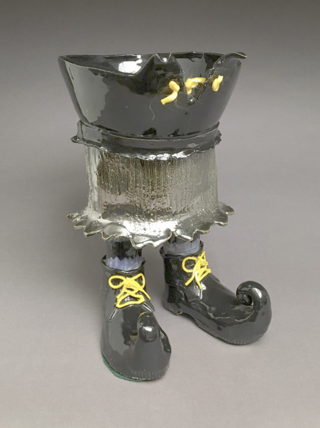 “Footed Bowls” are created from stoneware clay slabs and handbuilt. They are thematically based on interpretations of popular footwear designs or well known characters. “If there is an idea that intrigues me, I plow through the kinks until it meets my satisfaction. This is the impetus for these whimsical bowls as they become beloved personalities. They express attitude without a face. They can be functional, holding practical things, yet quirky. They are created with love and care with glaze applied with careful detail,” she said.