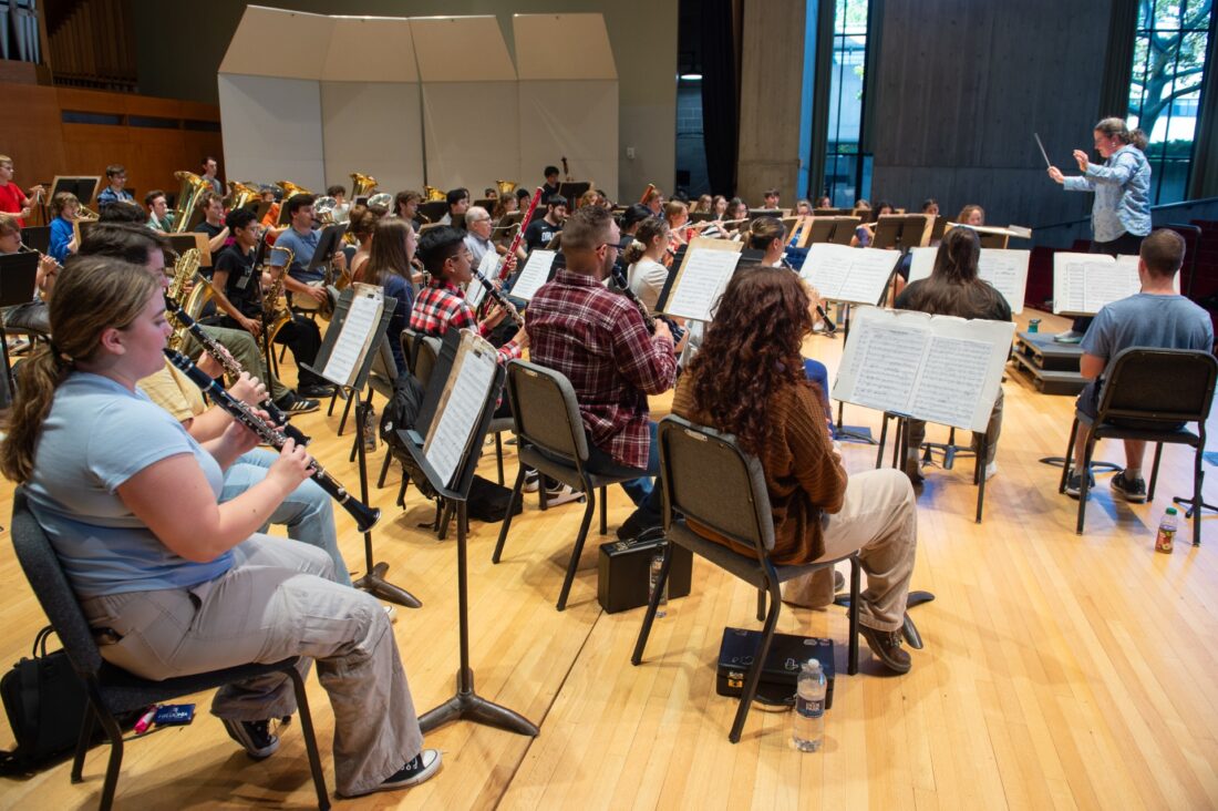 The band this year features 75 musicians, most of whom are music majors, along with students pursuing degrees in other academic areas. Many are first-year students, while those who are juniors or seniors advance to leadership roles as principals of sections and some are music majors playing on a secondary instrument to gain experience.