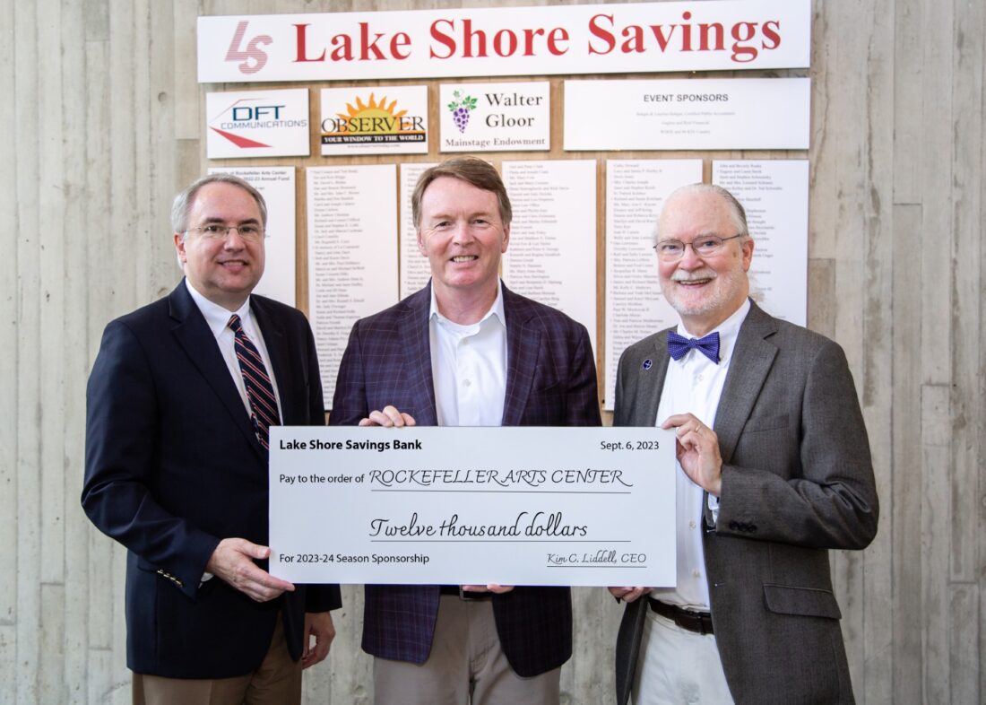 Kim C. Liddell, center, president and chief executive officer of Lake Shore Savings Bank, presents a $12,000 sponsorship check to Jefferson Westwood, right, Director of the Michael C. Rockefeller Arts Center and Tim Murphy, Director of Development for the Fredonia College Foundation. The 2023-24 season marks the 17th consecutive year Lake Shore Savings has been the season-wide sponsor for Rockefeller Arts Center.