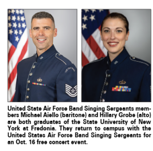 Technical Sgt. Michael Aiello (baritone) and Master Sgt. Hillary Grobe (alto) are graduates of the School of Music at the State University of New York at Fredonia. They will return to campus when The United States Air Force Concert Band and Singing Sergeants perform on Thursday at 7 p.m. in King Concert Hall.