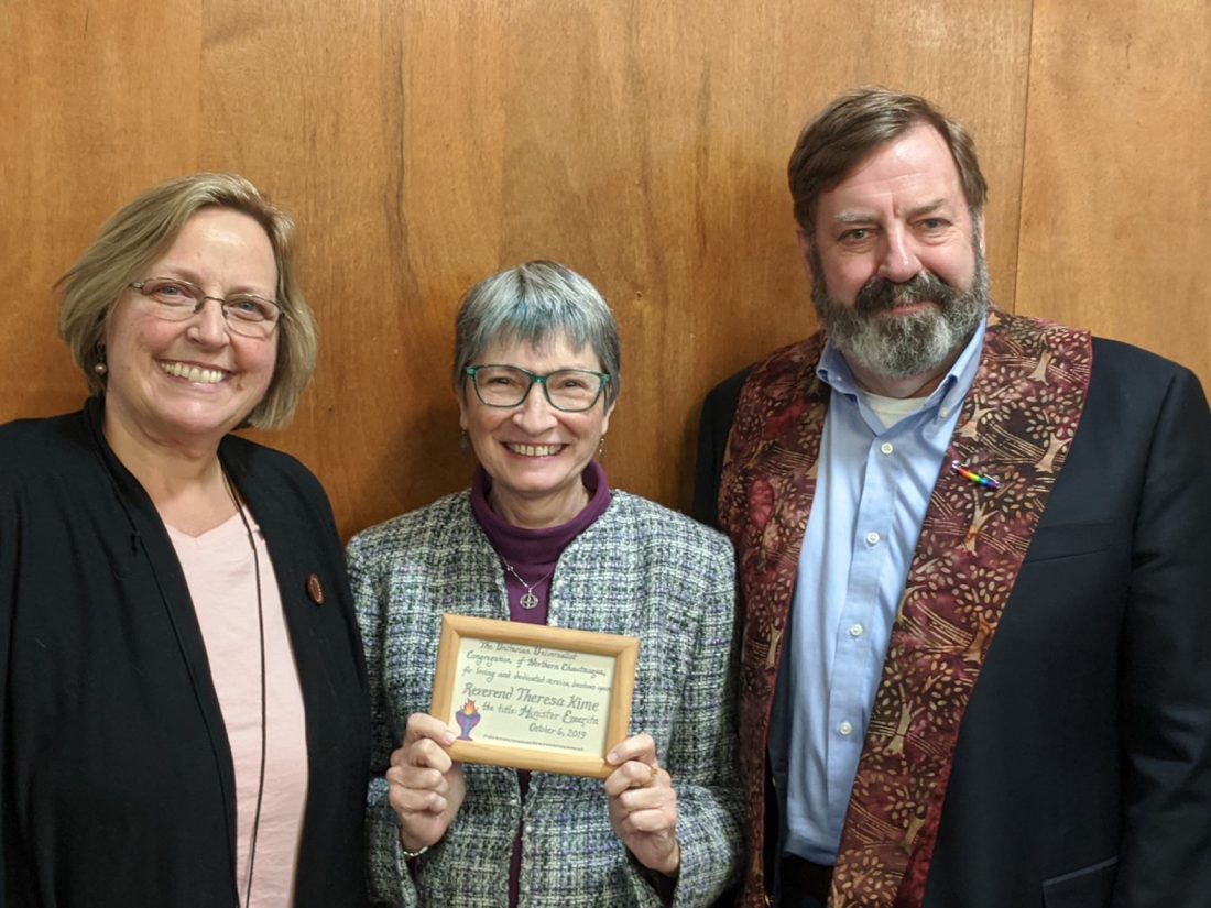 The Unitarian Universalist Congregation of Northern Chautauqua recently voted to bestow the honorary title of Minister Emerita on Reverend Theresa Kime for her devoted and faithful service to the congregation. Reverend Kime served the congregation for 12 years, until her retirement. The congregation gifted Kime with a framed certificate designed and hand drawn by Janey Wagner and a gift certificate to the Unitarian Universalist Association Book Store.