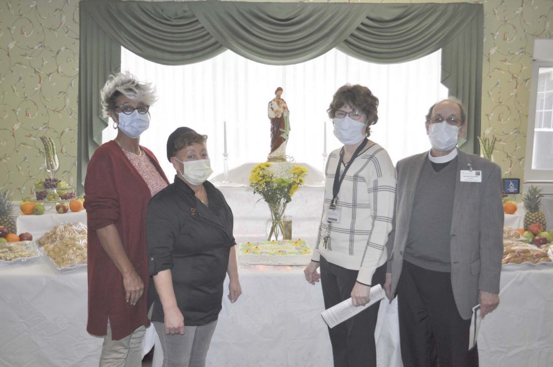 Submitted Photo Pictured (from left) Activities Coordinator Melissa Hartley, Chef Carm Vullo, Administrator Kathy Lynch, and Pastor Dan Rumfelt from Hultquist Place Assisted Living Program pose before the St. Joseph’s display prior to the luncheon.