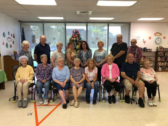 August birthday participants at the Dunkirk Senior Center include, from left, row one: Nancy Woloszyn, Mary C. Miller, Linda Mignoli, Paula Vogt, Donna Teeter, Bina Loftus, Tony Trippi, Jenny Naruszewicz. Row two are Carol Lajewski, Ron Krystofiak, Jerri Frank, Liz ...