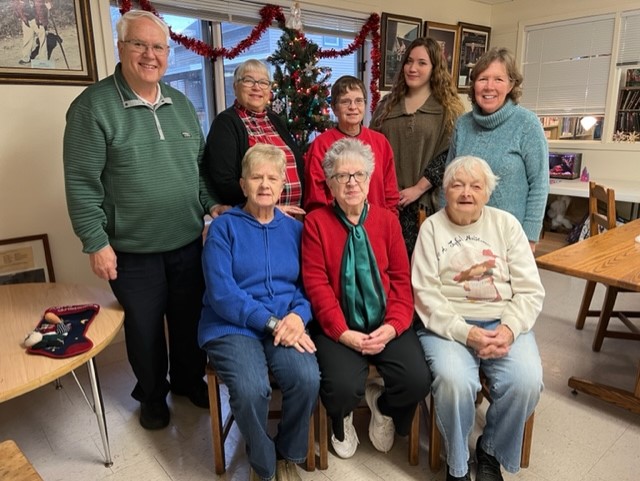 Members of the Cassadaga Library Association met for a business meeting and for decorating the library for Christmas. President June Woollett led the decorating of the tree, and others helped with the decorations and the window decorations. Shown standing from the left are John Sipos, Regina Burlingame Janet Ferry, Librarian Hannah Abram, and Treasurer Kathy George. Seated are Secretary Trudy Coulcher, Woollett, and Ruth Swanson.