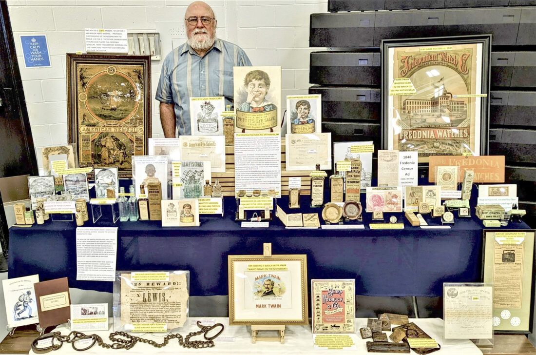 Dr. James Pettit’s American Eye Salve Company of Fredonia was featured as one of the 10 historical displays at Roberts Wesleyan College in Rochester on April 16. The antiques show was hosted by the Genesee Valley Bottle Collectors Association.