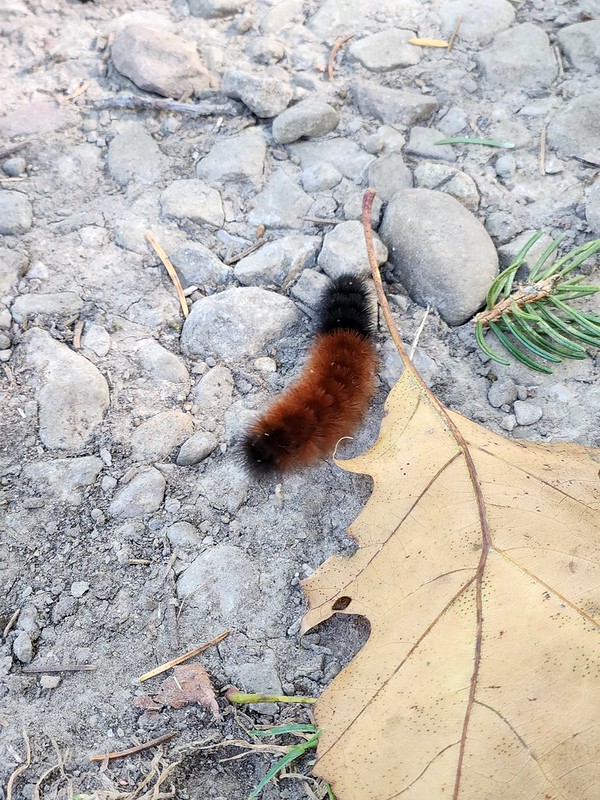 There are several types of woolly bears, but the one we usually see around western NY is the banded woolly bear. This caterpillar has thirteen body segments. The segments on either end are black and the middle segments are a rusty brown, but the exact number of rusty brown versus black segments can vary between individuals.