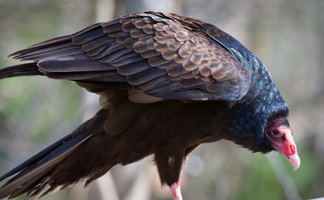 Another bird common to this area that shares the name “turkey,” is the Turkey Vulture. The head of a Turkey Vulture looks similar to the Wild Turkey, both with their red coloring. Vultures keep their heads feather-free in order to effectively rip apart carcasses without getting residue on their heads. Their behavior is much different than the Wild Turkey, first starting with their appetite. These birds are known for their scavenging behavior, feeding on remains such as roadkill.