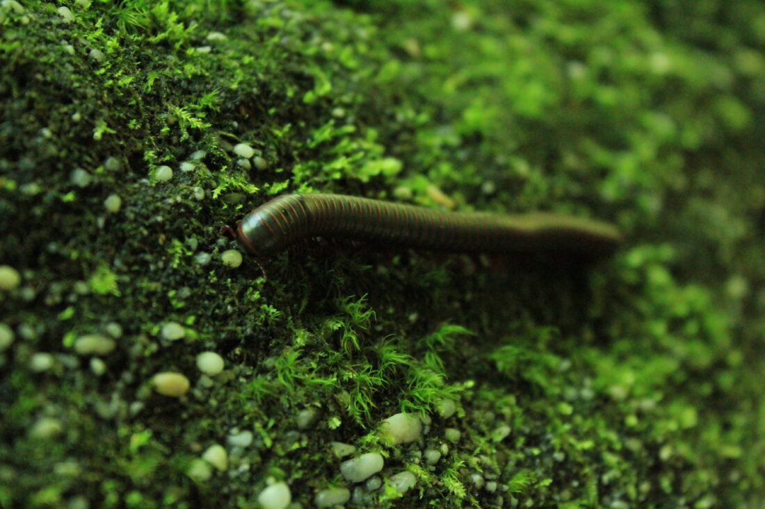 Photo by Emma Pryll American Giant Millipede crawling along a variety of broom moss (Dicranum scoparium) and sword moss (Callicladium haldanium) at Panama Rocks.