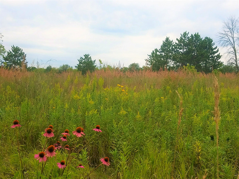 When I say the word ‘grass’, it’s likely that a mowed lawn or park comes to mind. But what if you think a little bigger, taller, and wilder? Grasslands are evocative in both the summer and fall. Summer brings out an abundance of colorful flowers, tall plants, and the birds and insects that utilize them. Autumn grasslands, at least around here, are oceans of golds and purples, as goldenrod and other late summer flowers bloom as long as they can before their world freezes and the plants die back to stems and seeds.