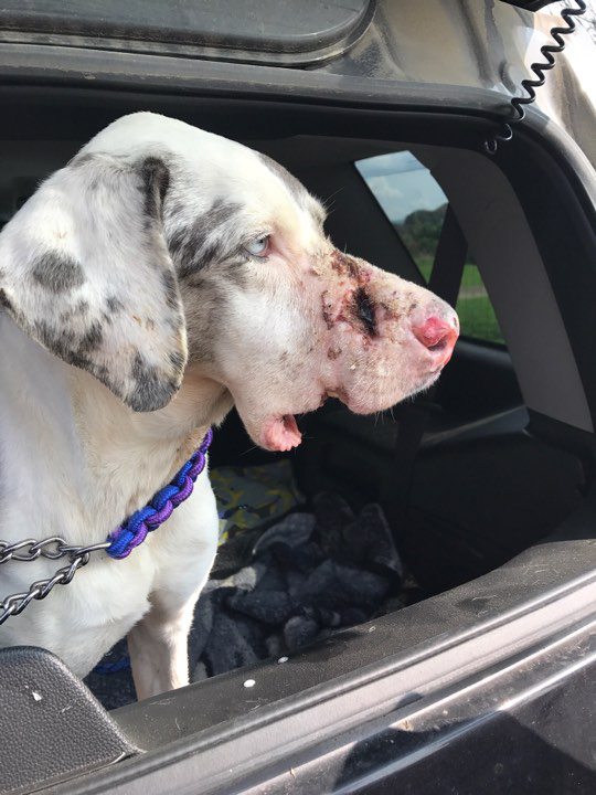 “She was ripped apart,” said Mrs. Cunningham. The canine’s jaw was completely exposed with bite marks and puncture wounds on her face and legs. Polly was rushed to the veterinarian, where she was found to have no internal injuries.