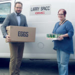 The Chautauqua County Rural Ministry recently received a donation of 400 pounds of miscellaneous canned goods from Larry Spacc GMC. Previously, Larry Spacc GMC donated four pallets of juice. Pictured are Brett Kuhlman of Larry Spacc GMC and Bridget Majka of CCRM. “We were able to give juice to every family, something we’re not usually able to do,” said CCRM Executive Director Kathy Peterson. “That was nice. At Larry Spacc, we’ve got your back, and we apply that philosophy to more than just our business. We are thrilled to be able to contribute to our community,” Kuhlman stated.