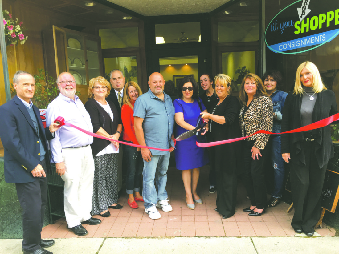 Drop Till You Shoppe Consignments store, located at 10 W. Main St., Fredonia, recently had its ribbon cutting. Fredonia Mayor Athanasia Landis, middle in dress, cut the ribbon with store co-owner Michele Joy as her husband, who she co-owns it with, Michael Joy stands on the other side of Landis. Fredonia trustees and members of the chamber of commerce filled the store prior to the ribbon cutting. Michele Joy said, “We sell gently used furniture, clothing, assessories and household items.”
