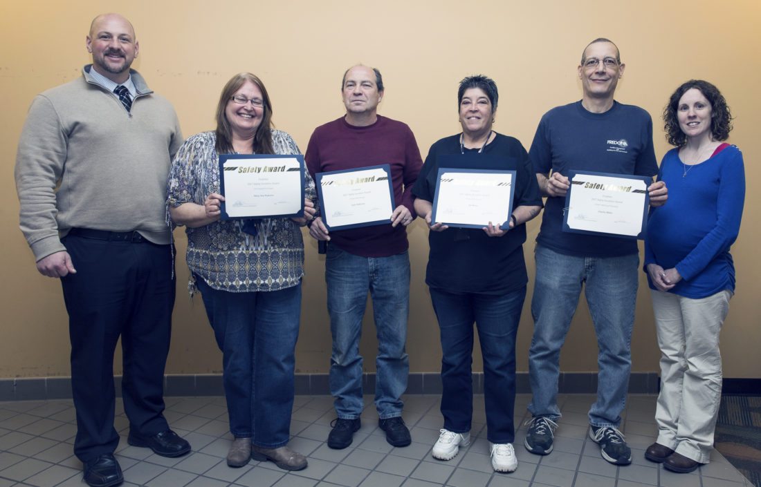 Submitted Photo Displaying their Custodial Safety Incentive Award certificates are (beginning second from left): Mary Ann Wykstra, Iris Rosa, Jack Anderson and Charles Miller, along with Mark Delcamp, assistant director of Custodial Services (far left) and Sarah Laurie, director of Environmental Health, Safety and Sustainability (far right).