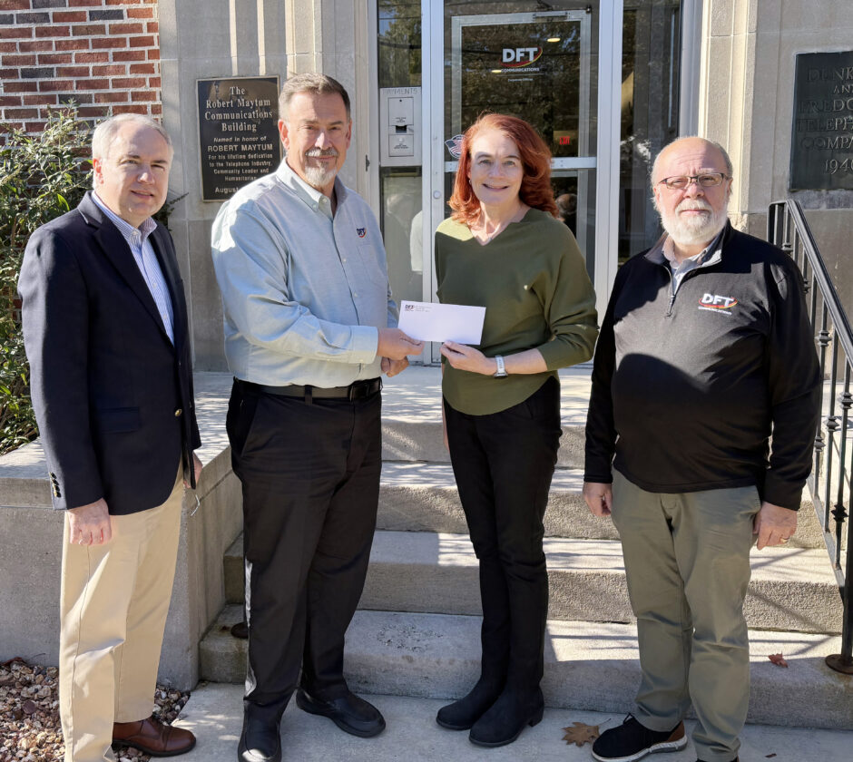 Kurt Maytum, second from left, president and chief technical officer for DFT Communications, presents a sponsorship check to Alison L. Barry, second from right, director of Rockefeller Arts Center, marking DFT’s 18th season as the pops series sponsor at the State University of New York at Fredonia. Looking on are Tim Murphy, left, director of development for the Fredonia College Foundation and Dan Siracuse, marketing and public relations manager for DFT Communications.