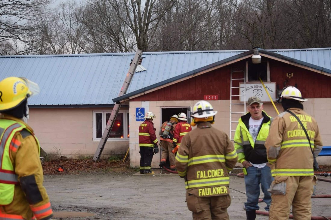 Photo by Dan Kohler Firefighters are pictured Saturday morning at the Ellington Rod and Gun Cub after fire broke out.