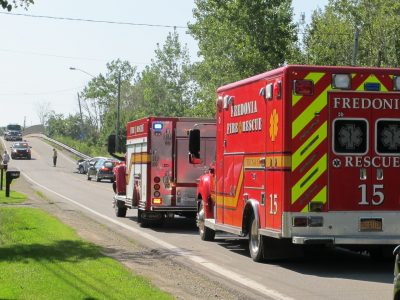 Fredonia Fire Department and the Chautauqua County Sheriff’s Department were on the scene of a two-car collision that led to a rollover of one vehicle at VanBuren and Farrel roads outside the village. The accident occurred around 3:30 p.m. Tuesday. When units arrived on scene one of the operators, 93-year-old Elizabeth A. Abram of Berry Road, Fredonia, had sustained minor injuries. The other operator, Birgitta H. Marrano of Fredonia did not sustain any injuries from the accident. Abram was later flown from the scene by Mercy Flight to Erie County Medical Center in Buffalo for non-life threatening injuries. At this time the investigation is ongoing and charges may be filed at a later date.