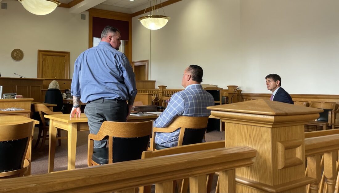 OBSERVER Photo by Gregory Bacon Michael Ellis, left, turns and apologizes to Bob Bonar, not pictured, for destroying the Mayville Diner, before Judge Grace Hanlon issued the sentencing for the guilty plea to fourth-degree arson. Also pictured is Ellis' attorney Anthony Lana (center) and District Attorney Jason Schmidt.