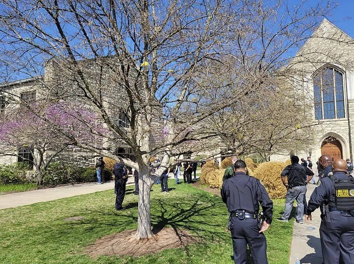 Police officers with rifles, heavy vests and helmets could be seen walking through the school parking lot and around the grassy perimeter of the building Monday morning. Helicopter footage from WTVF also showed the officers looking around a wooded area between the campus and a nearby road.