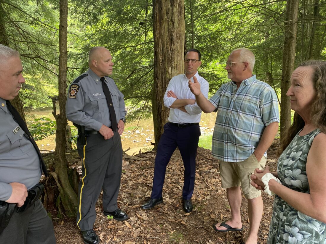 Times Observer photo by Josh Cotton Gov. Josh Shapiro, center, meets Tuesday afternoon with Ron and Cindy Ecklund, right, whose tip resulted in the apprehension of jail escapee Michael Burham. They were joined on a visit to the banks of Jackson Run where they confronted Burham by, left, Maj. William Maitland, state police Area 1 Commander and Lt. Col. George Bivens, Pennsylvania State Police deputy commissioner of operations.