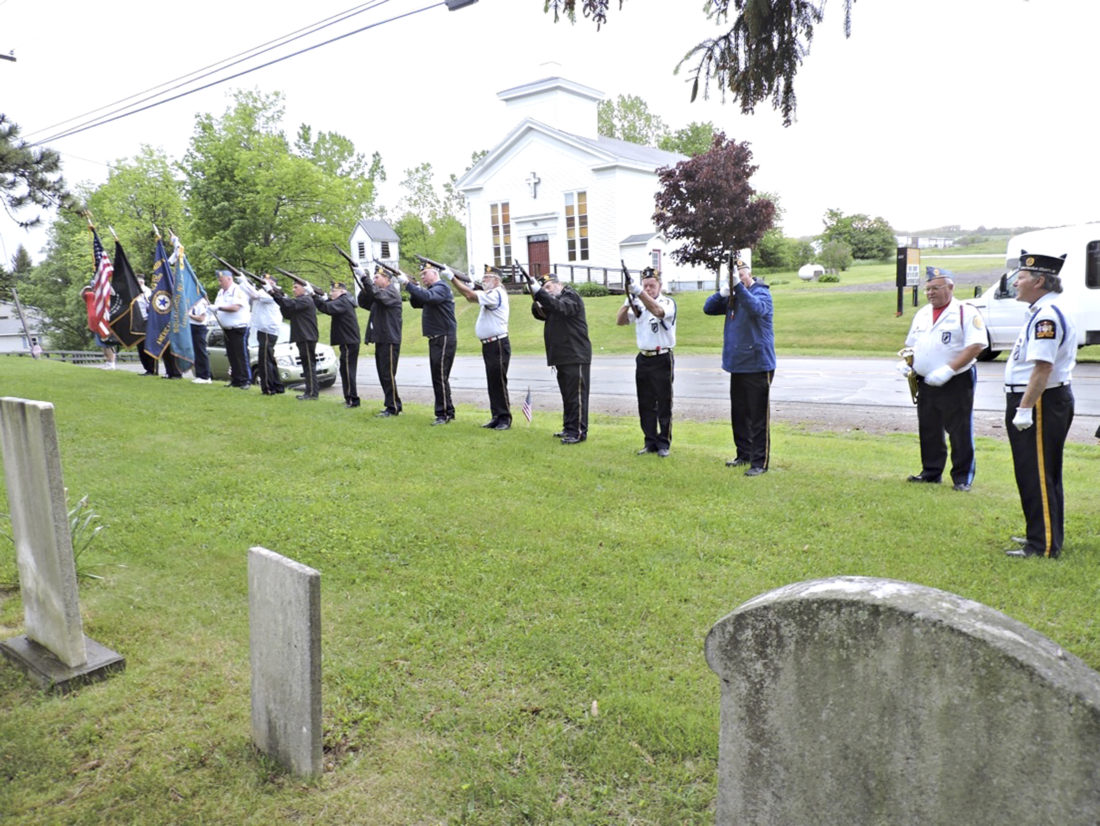 Submitted Photo Members of the Cassadaga American Legion Post 1280 Honor Guard gave tribute to veterans at 10 area cemeteries. Shown is the group in formation under the leadership of James Hayward at the Charlotte Center Cemetery.