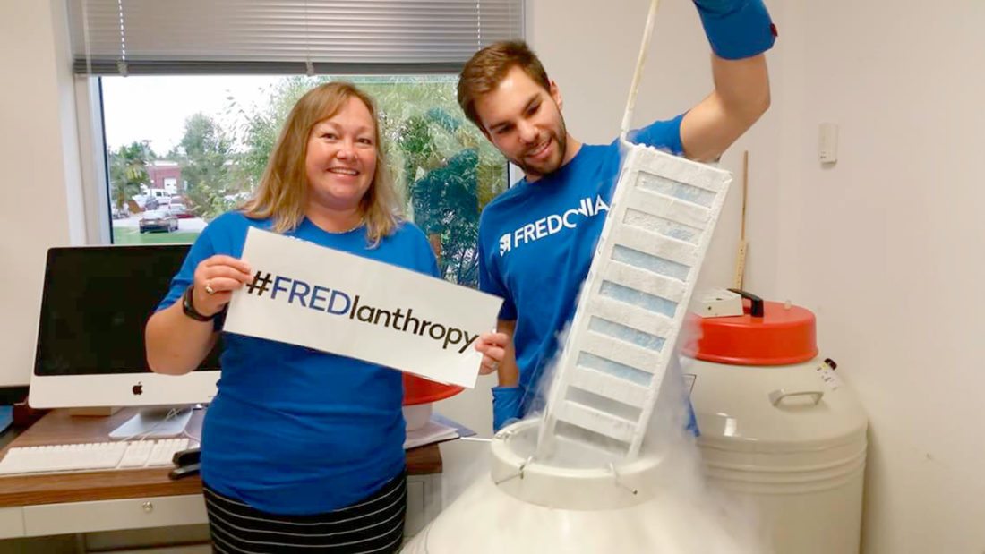 Fredonia alumni Nick Catanzaro, ‘13, with Dr. Deborah Good, ‘87, at Virginia Tech, having fun celebrating last fall’s #FREDlanthropy Day.