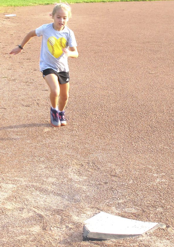 - Rylee Weiskerger dashes towards home plate during the baserun competition of Tuesday’s Festival of Grapes pentathlon.