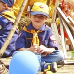 - A Cub Scout sits on the float