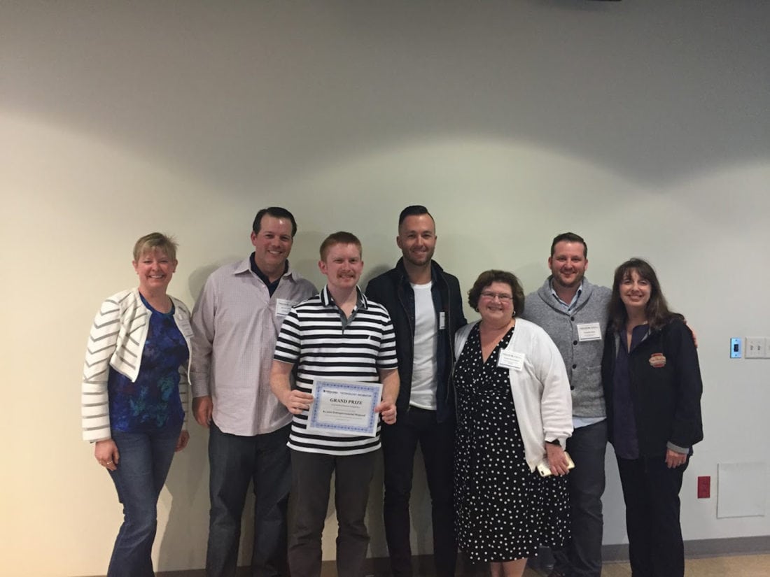 Pictured left to right are Jennifer Koss, Co-founder, Designer, & Head of Operations, Rosie Furniture; Kevin Sylvester, Manager and Co-Owner, Sylvester & Peck Media LLC; John McIvor, Grand Prize Winner; Rob Hopkins, Founder and Designer, Stronghold Studio; Susan McNamara, Assistant Professor & Internship Coordinator, Fredonia; Nicholas Haas, Partner and Creative Director, [Re]noun Creative; and Gina Kron, Owner of Tim Horton’s local franchises.