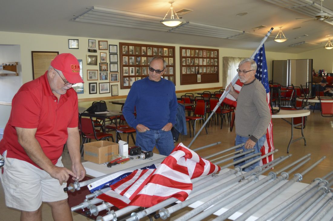 Submitted Photo Shown in the photograph are Bruce Kaus, Ron Gross and Steve Pangborn attaching flags to the poles.