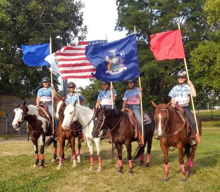 The last event on Friday was a special treat. It was the performance of Chautauqua County’s Parade Team. Chautauqua County hasn’t had a parade team in 12 years. It was a special event to all who attended on that beautiful evening. A Parade Team consists of a team of five horses and riders performing a timed routine to music while carrying flags: one American Flag, one New York State Flag, one 4-H Flag and one red flag and one blue flag. By the way, flapping flags around horses is not the easiest thing to teach them to accept! The planning begins early in the 4-H year when the team, with their coach, begin working months in advance by writing the choreography, picking out the music plus many hours of practicing, and of course, designing the costumes to go along with the theme of the music.