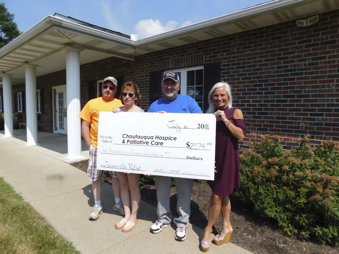 More than 300 people attended the Third Annual “Skinner-Ville Summer Pig Out” which was held on Saturday, July 14 at the Chautauqua County Fireman’s Grounds in Stockton. The family event is organized in loving memory of Darlene Skinner by her children, Michael Skinner, Rosella Skinner, Christopher Skinner and Betty Jo Glazer. The family hosts the fundraiser each year to benefit the services of Chautauqua Hospice and Palliative Care as a way to keep a promise to their mother, who requested that they “gather every year and celebrate life.” Pictured from left are Chris Skinner, Betty Jo Glazer, Mike Skinner and BJ Buonaiuto, CHPC community events coordinator.