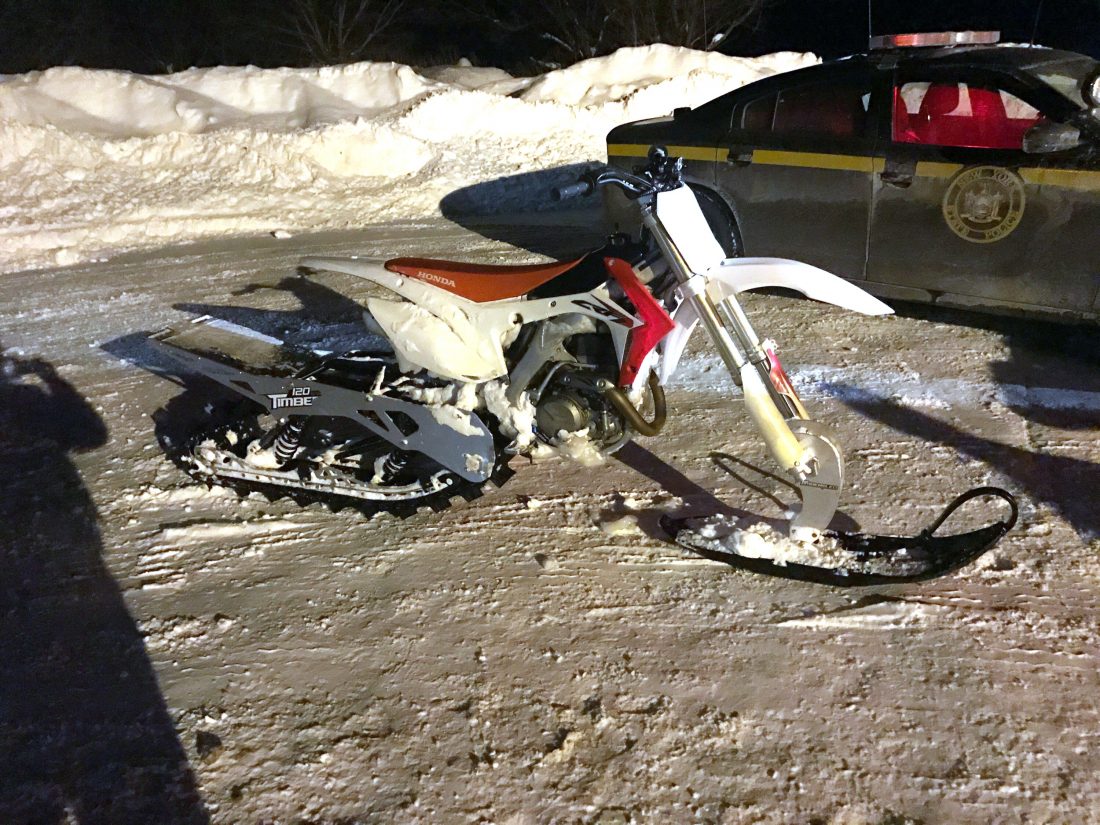Photo by the New York State Police Two Erie, Pa., men were charged after reportedly causing damage to a golf course at Peek'n Peak Resort this week. Pictured is one the "snowbikes" used in the incident.