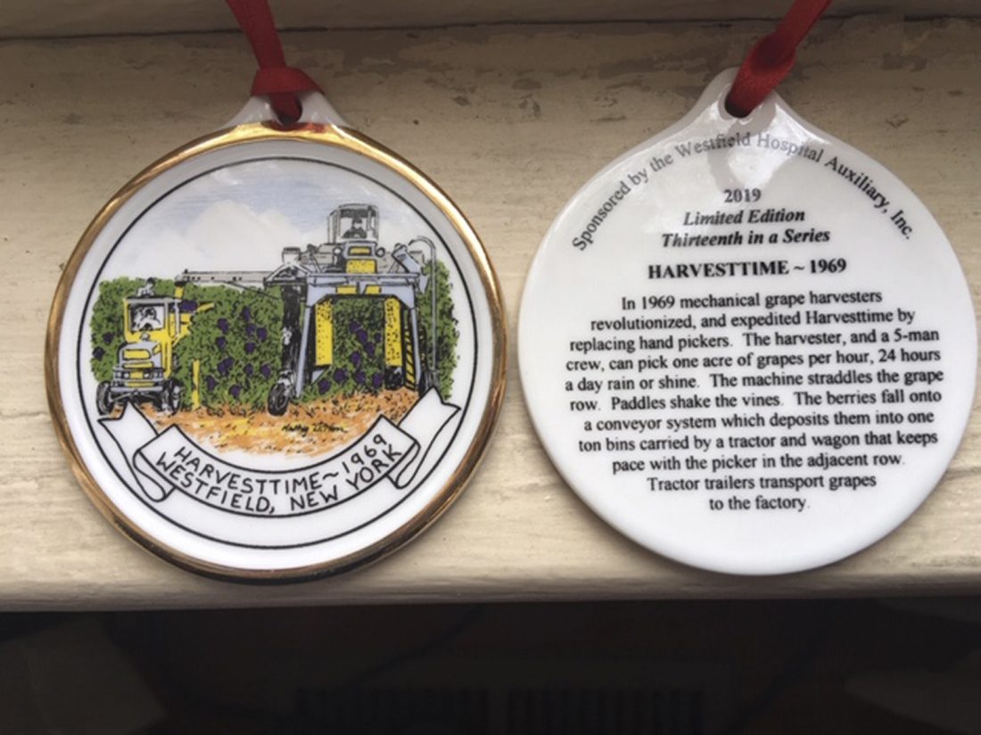 The WMH Auxiliary Board is pleased to announce that their 2019 ornament is now available. This is the 13th year in the limited edition series. This year’s ornament celebrates the advent of the Mechanical Grape Harvester and is titled “Harvestime 1969.” In 1969 mechanical grape harvesters revolutionized and expedited harvest time by replacing hand pickers. What once took up to six weeks could be accomplished in a matter of days. The harvester and a five-man crew could pick one acre of grapes per hour, 24 hours per day, come rain or shine! The machine straddles the grape row. Paddles shake the vines. The grape berries fall onto a conveyor system which deposits them into one ton bins carried by a tractor and trailer that keeps pace with the picker in the adjacent row. Tractor trailers transport the grapes to the processing plants.