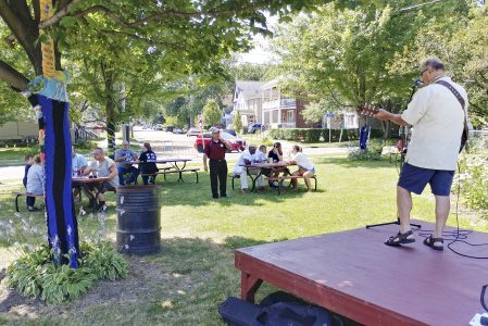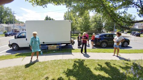 Mary’s Deli of Dunkirk marked 40 years of service with a party Tuesday outside its Main Street store. The event acted as a food drive for the Chautauqua County Rural Ministry’s emergency food pantry. People who attended got a slice of pizza, a bottle of water and a popsicle in exchange for the donation of a canned food item. “You’re doing the work of God,” Mary’s Deli owner/manager Kevin Russo told one donor. Above, attendees listen to a guitarist. At right is the Rural Ministry box truck which stored the donations. The people next to the minivan had just donated several dozen cans.