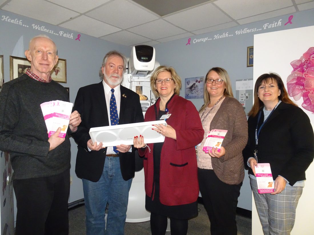 WESTFIELD — Representatives of the Rotary Club of Westfield-Mayville and the Allegheny Health Network / Westfield Memorial Hospital (AHN/WMH) gathered in the mammography suite of AHN/WMH in Westfield on Feb. 3 for a presentation of items provided by this Rotary club for the hospital staff to use with some of its patients. Specifically, the contributions included two sets of three breast self-examination (BSE) models, and 1,000 shower cards which provide BSE instruction and information.