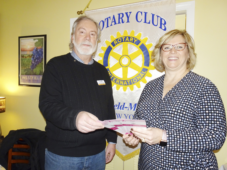 Submitted Photo John Hamels, Ph.D., Westfield-Mayville Rotary Club President, welcomed Karen Surkala, Westfield Memorial Hospital (WMH) President, as the guest program presenter during the Feb. 18 Westfield-Mayville Rotary Club meeting at The Parkview in Westfield. They are holding some of the breast cancer early detection shower cards that were recently donated to WMH by this Rotary club. Surkala discussed highlights of the WMH’s 2019 year.