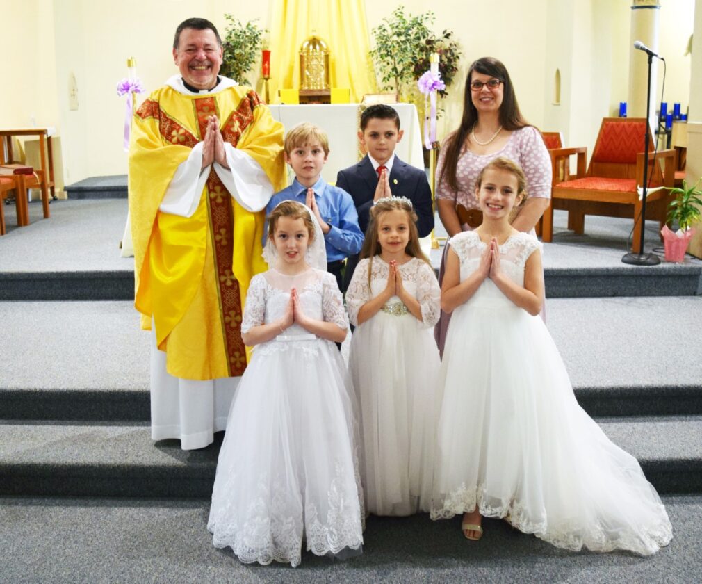 Submitted Photo Five children from St. Joseph Church in Fredonia received their First Communion at Mass on Sunday, May 1. In front are Ingrid Hegna, Isabelle Kropp, Valentina Bown. In back are the Rev. Joseph A. Walter, Isaac Mallory, Landon Pankow and Denise Kropp, catechist.