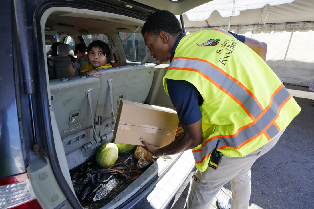 A volunteer fills up a vehicle with food boxes at the St. Mary's Food Bank Wednesday, June 29, 2022, in Phoenix. The food banks are struggling to meet the growing need even as federal programs provide less food to distribute, grocery store donations wane and cash gifts don’t go nearly as far. (AP Photo/Ross D. Franklin)