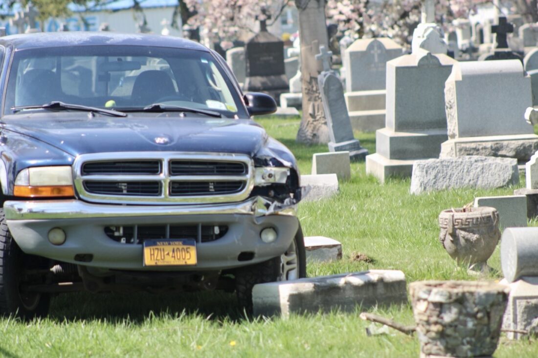 A Dodge pickup truck veered off Williams Street East and struck a headstone at St. Mary’s Cemetery off Bennett Road on Friday afternoon shortly before 1 p.m. Only one vehicle was at the scene of the accident as of 1:15 p.m., with only the driver of the vehicle observed speaking with State Police on the scene. Traffic was not impacted by the incident.