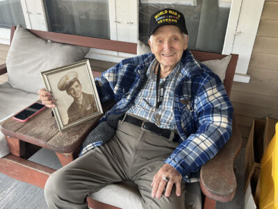 Photo by Eric Tichy Tommy Tedesco holds a photograph of himself taken while serving in the military during World War II. At the cusp of turning 99 years old, Tedesco is known both for his service and growing rhubarb around his East Second Street home.