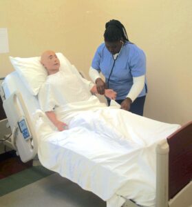 P-J photos by Christopher Blakeslee Janascia Vincent, a resident of New York City and Certified Nursing Assistant student at the Cassadaga Job Corps Academy, checks the heart rate of a highly robotic and intelligent android used by nursing student in their training.