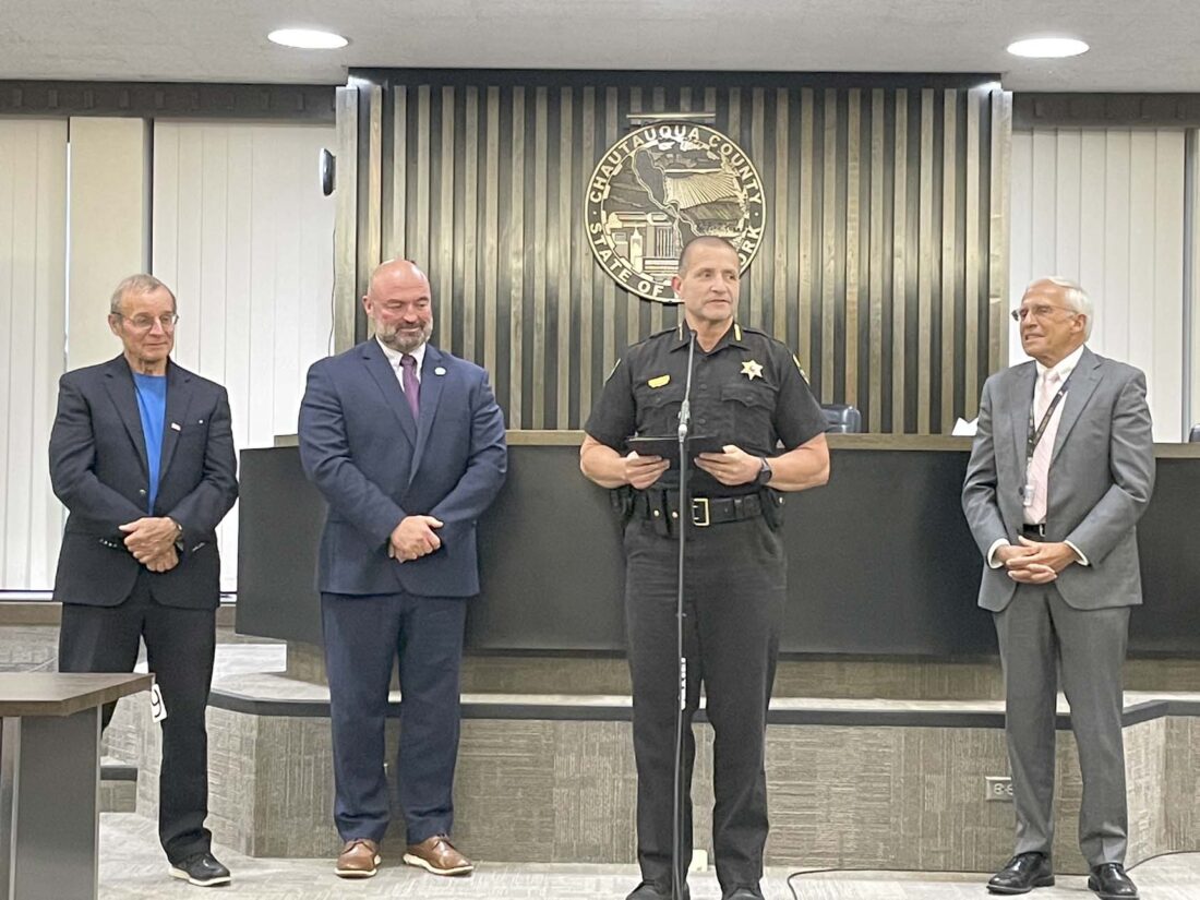 Sept. 17-23 has been proclaimed Sheriff’s Week in Chautauqua County. Pictured, Sheriff James Quattrone accepts the proclamation during the recent county legislature meeting. Pictured with him, from left, is Legislator Terry Niebel, R-Sheridan, the chairman of the Public Safety Committee, County Executive PJ Wendel, and Legislature Chairman Pierre Chagnon.