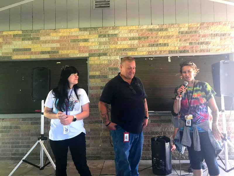 Ken Kendall, Mental Health Association Peer Specialist Morgan Rowley (left), North County Recovery Center manager and Roseann Crocker, Strong Starts navigator welcomed a large crowd to the recent Participant Celebration in Dunkirk’s Point Gratiot Park.