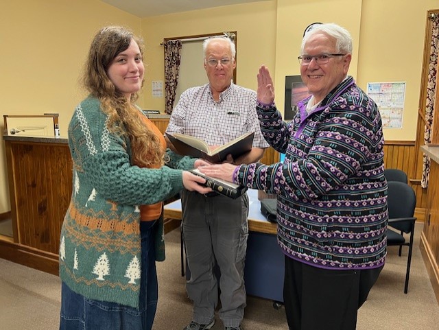 John Sipos, Town of Stockton Historian, was appointed Councilman to the Stockton Town Board. Sipos was appointed to complete the term of a 33-year member who resigned due to health conditions. Shown in the photograph taking the oath of office are Hannah Abram, with Stockton Town Supervisor David Wilson and Sipos. Wilson said it is all legal, as Sipos is filling in for an elected official. Sipos attended the Board meetings for the last five years, giving a brief history report of the area each month. The Stockton Town Board meets on the second Tuesday of each month in the Stockton Town Hall at 7 p.m.