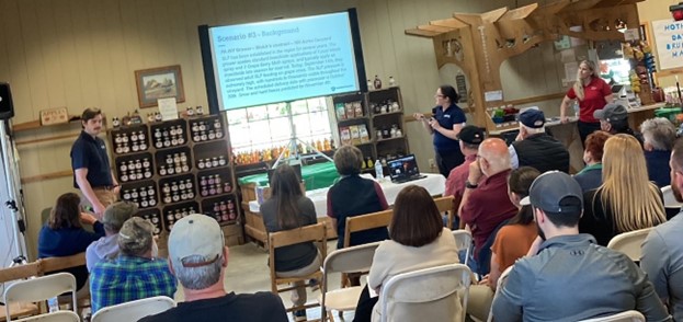 The final presentation was a grower panel that was joined by Zoom. Dean Scott, Ben Cody, Zach Waltz, Carl Helrich, and Rich Blair were the growers that assisted in the panel who are vineyard owners and managers from southeastern Pennsylvania that have been dealing with the SLF infestation for many years. They were able to discuss practical strategies, tips, successes, and concerns with the audience at Burch Farms which went a long way to ease anxieties for our growers who have not dealt with this pest as of yet.